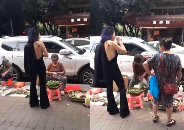 唱歌也要戴着帽子,确认过眼神,帽子才是半永久。在路边买个菜更是西服上衣单肩披,一头紫发真狂野。这样的造型出门,难怪会成为街头最靓的仔,路边两位大妈都忍不住目不转睛地盯着她看。这位姐果然是不走寻常路哇.