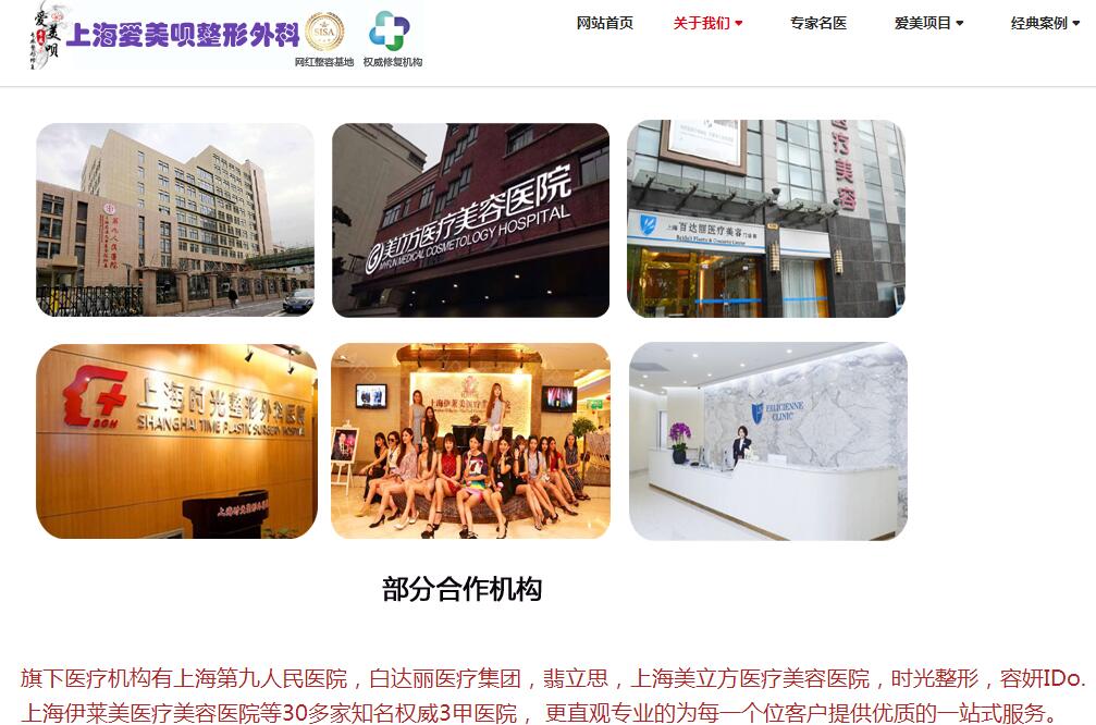 上海爱美呗医疗整形医院更有夸大包装说旗下医疗机构有上海第九人民医院,白达丽医疗集团,翡立思,上海美立方医疗美容医院,时光整形,容妍IDo.上海伊莱美医疗美容医院等三十多家知名权威三甲医院, 更直观专业的为每一个位客户提供优质的一站式服务。